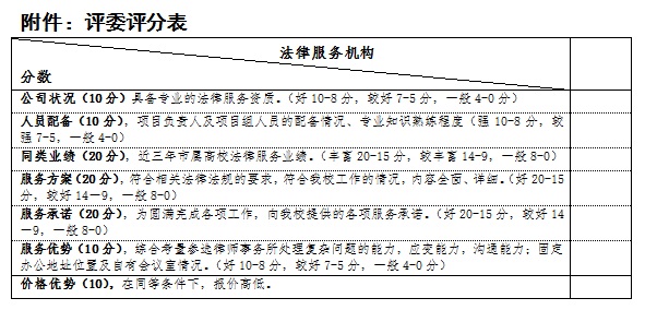 遴选方法:综合评分法,根据评委的评分,按综合得分排序,确定法律服务机构1家